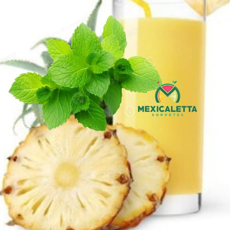Suco de abacaxi e hortelã natural, com gelo opcional, sem adição de adoçante ou açúcar.