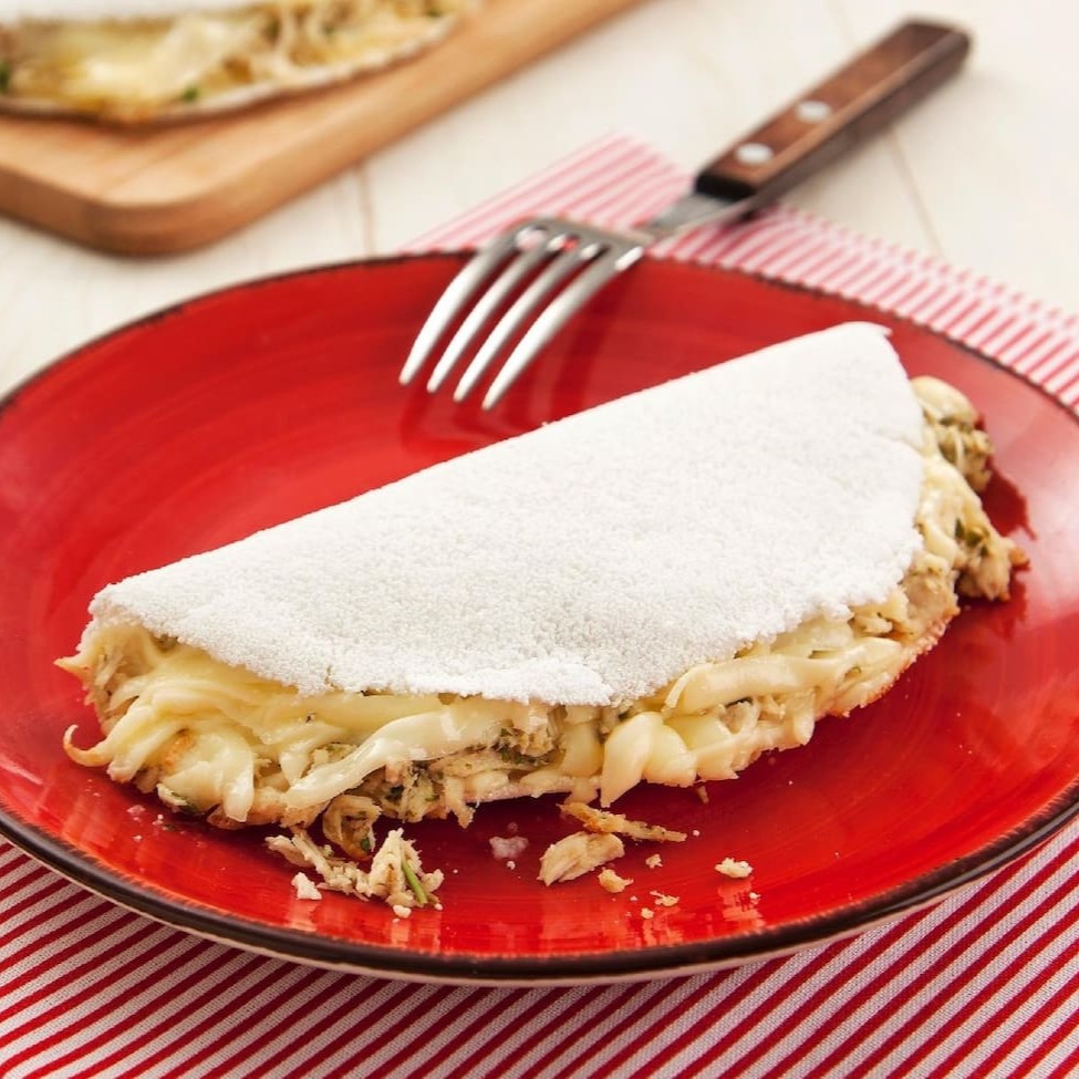 Cuscuz de 500g, feito na hora. Recheado com frango desfiado e mussarela ao meio e por fora. Serve 1 pessoa
