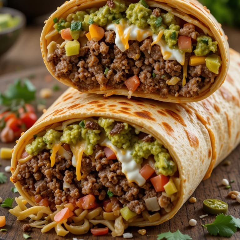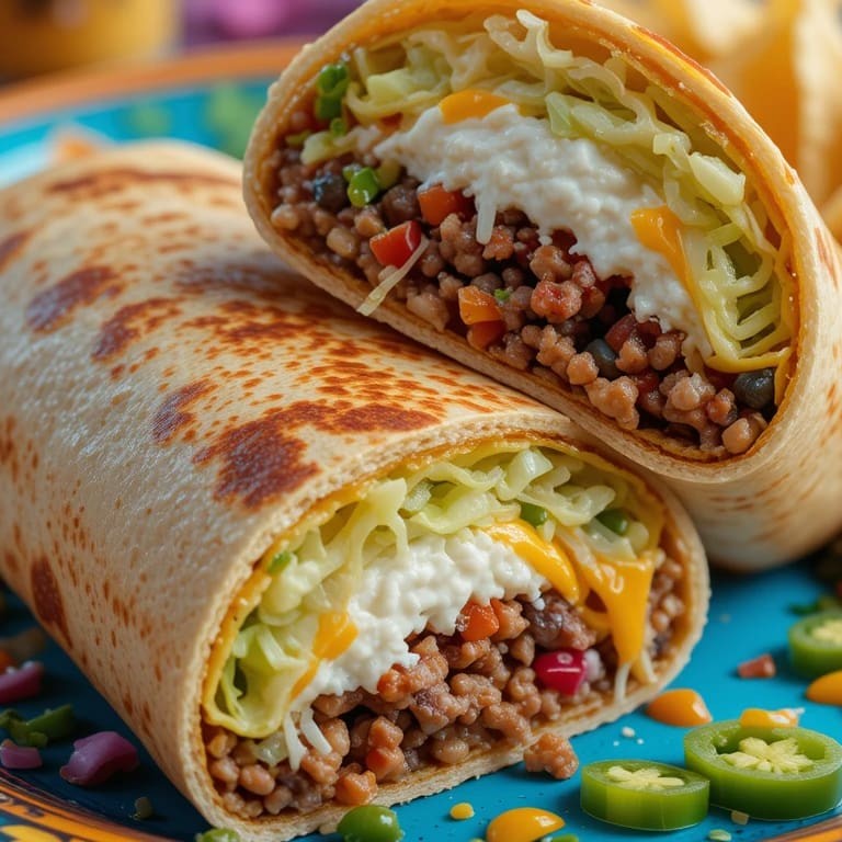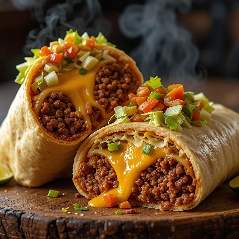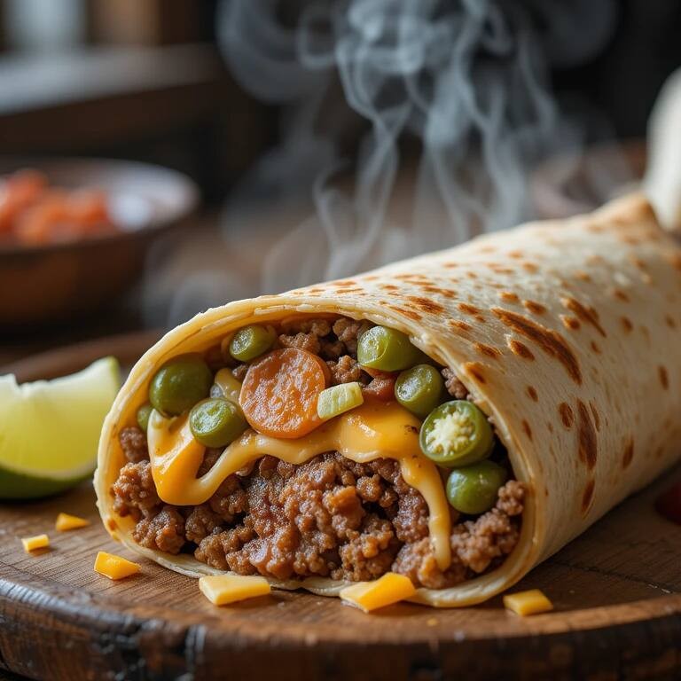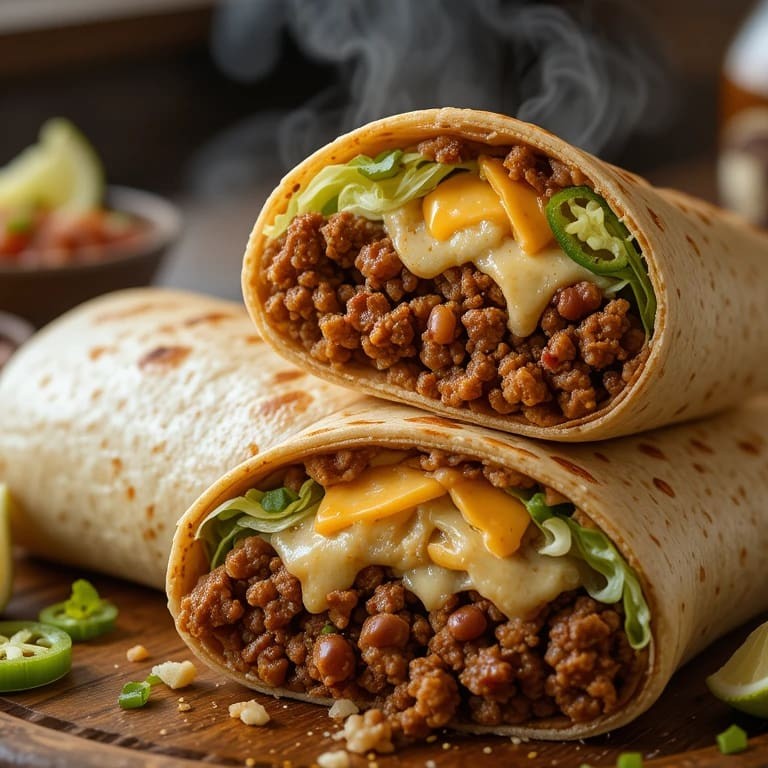 Tortilla de trigo recheada com chilli beans (levemente picante), carne moída mexicana, queijo cheddar cremoso, alface americana e pico de gallo. Peso médio 400 g. Contém glúten e lactose.