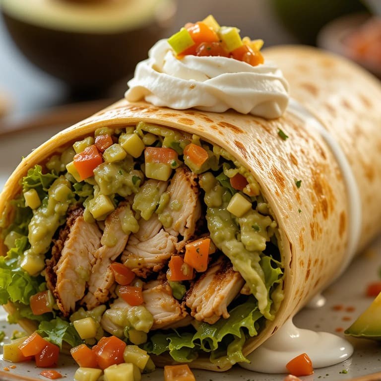 "Tortilla de trigo recheada com frango grelhado, guacamole, alface americana, pico de gallo (vinagrete) e sour cream. Peso médio 450 g. Contém glúten e lactose. << Atençâo >> Este burrito Não é considerado ""quente"", o recheios são colocados em temperatura refrigerada, exceção do frango."