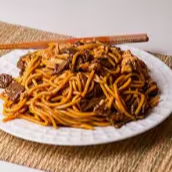 Yakisoba de carne e frango, macarrão de yakisoba, molho da casa com olho de gergelim e shoyu