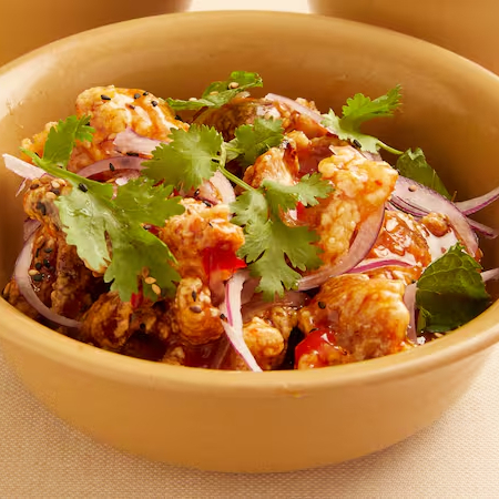 frango frito e empanado, com molho sweet chilli, mix de ervas e cebola roxa.