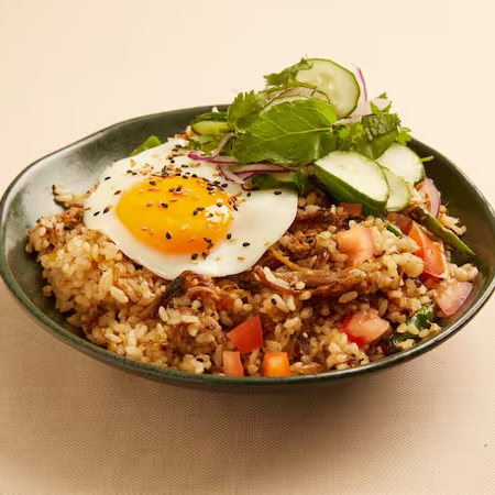 arroz japonês, costela desfiada, legumes, mix de ervas, pepino e cebola roxa e ovo frito. ( Não contem pimenta)
