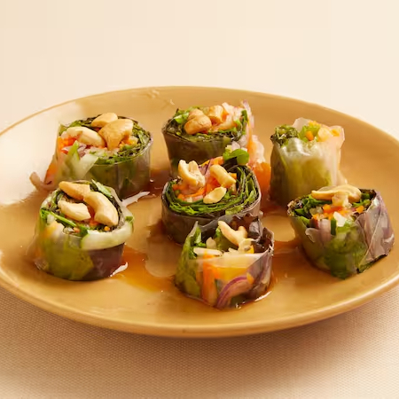 mix de folhas, ervas temperadas, picles de cenora e nab, envoltos em uma fina massa de arroz.