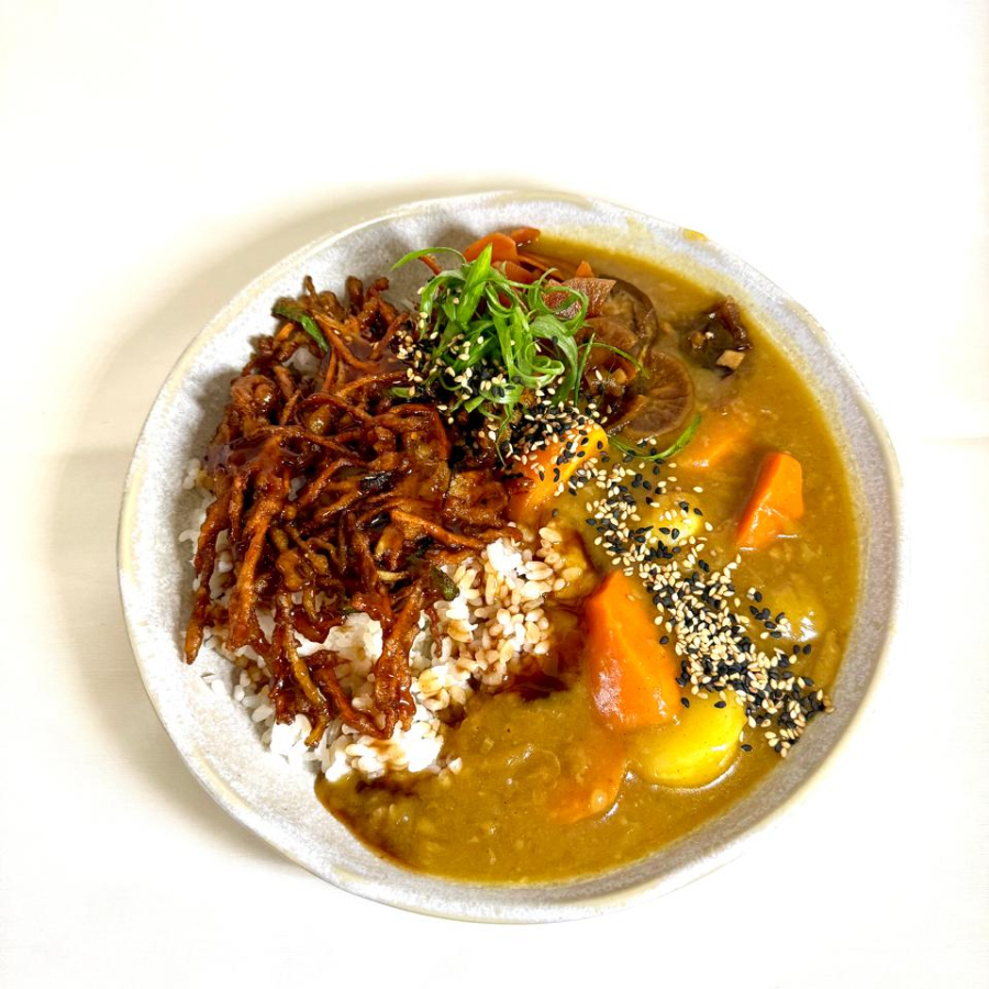 curry japonês, lombo de porco empanado, legumes e gorah.