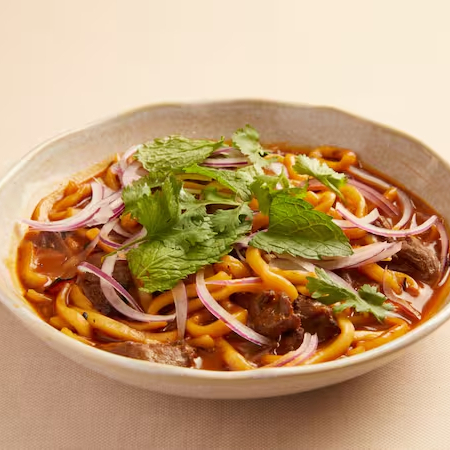 macarrão udon, cordeiro, molho xian e ervas frescas. (Preparado na Wok)