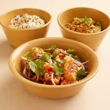 frango frito e empanado com molho sweet chilli, cebola roxa e ervas frescas, gohan e saladinha de batata. Não contém glúten.