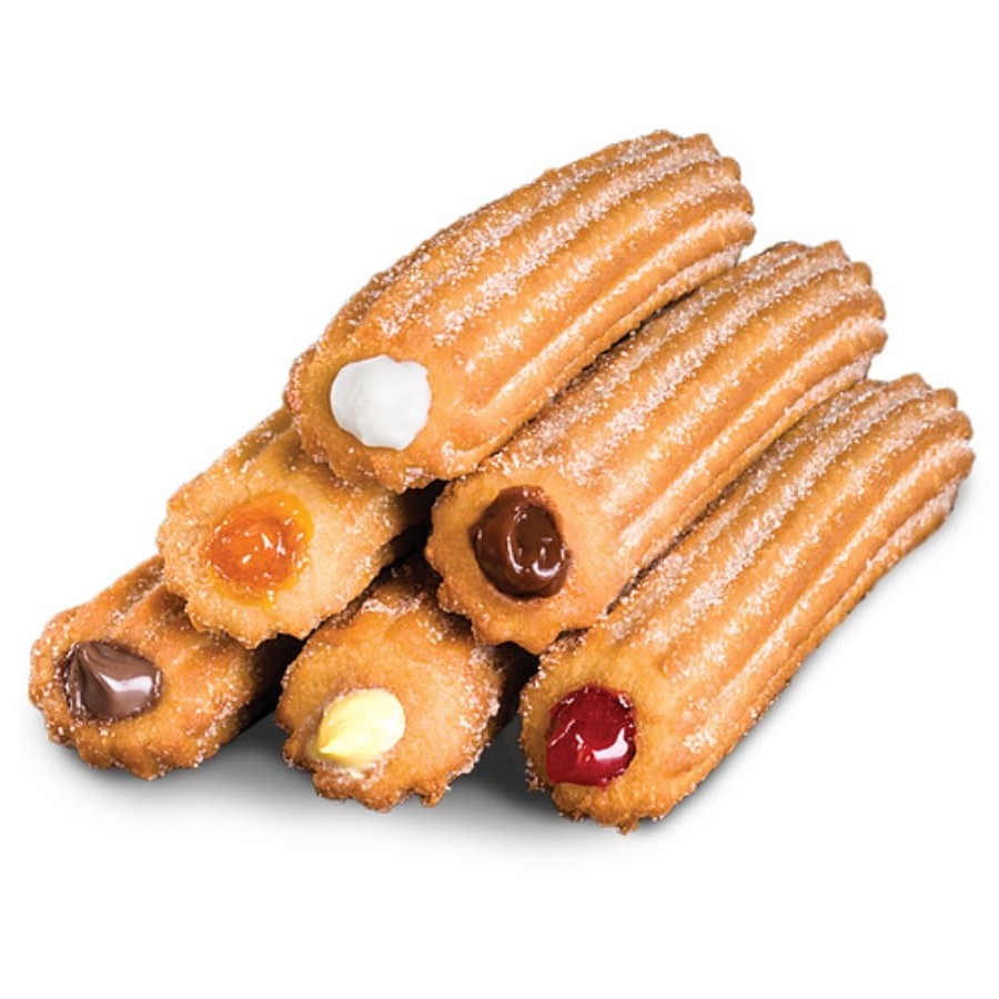 Churros recheado na parte interna e uma camada generosa em uma de suas extremidades.