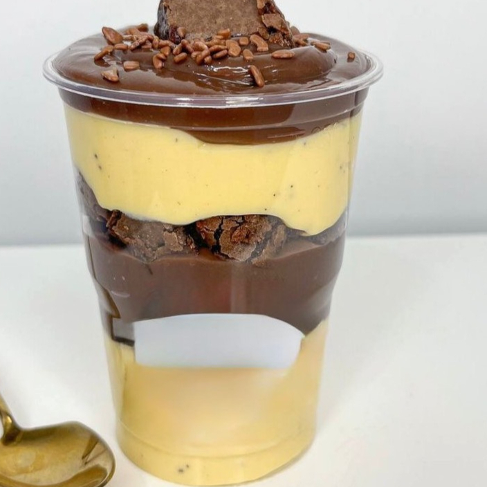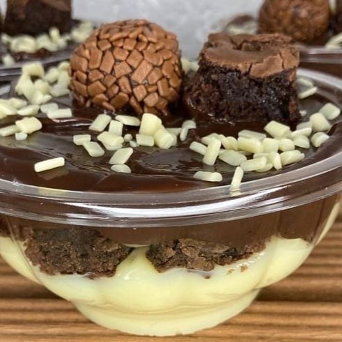 Delicioso brownie no pote , intercalado com brigadeiro branco super cremoso ,pedaços de brownie e brigadeiro super cremoso. Finalizado com granulado de chocolate branco e brigadeiro boleado envolvido no granulado belga Tag: doces , brownie , pizza, tortas , salgados , hambúrguer, chocolate, leite Ninho , Nutella