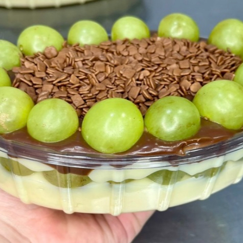 Delicioso bombom de pote de uva, composto por brigadeiro branco extremamente cremoso, uvas verdes, finalizado com ganache de chocolate ao leite, e granulado belga callebaut Tah: bombom, uva, kit festa, doces, brigadeiro, copos, Kinder, chocolate, Nutella, sobremesa, taxa grátis, frete grátis, cupom, descontão, desconto, almoço.