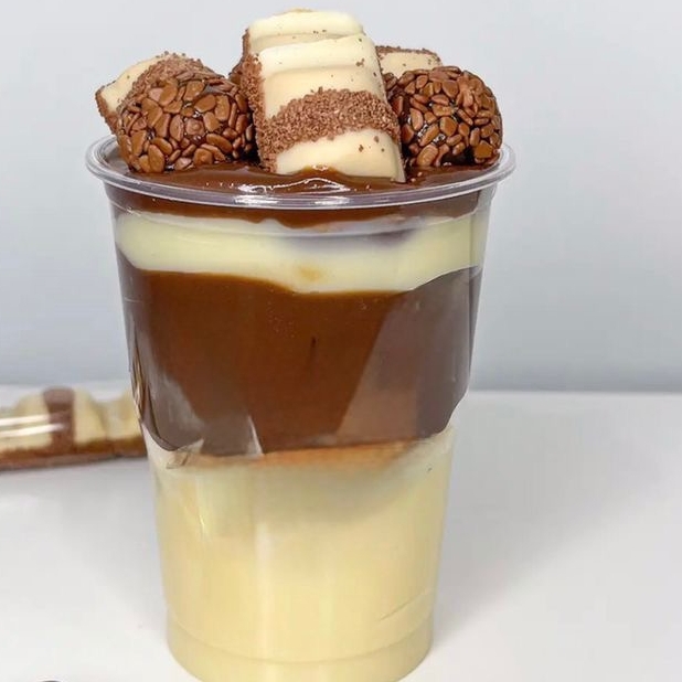 Maravilhoso copo Kinder composto por brigadeiro branco e brigadeiro ao leite ,Kinder Bueno