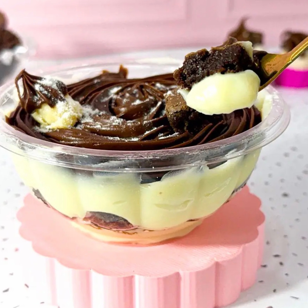 Para os apaixonados por chocolate, esse sabor de brownie chocolatudo e perfeito é composta por camadas de creme delicioso de chocolate, pedaços de brownie e finalizado com raspas de chocolate ao leite Tag: doces, brownie, chocolate, bolo, bolo de cenoura, festa, tortas, tortas salgada, hambúrguer, lanche, pizza, promoção, cupom, entrega grátis, 7,99 , 0,99 banoffee , Ninho , Nutella.
