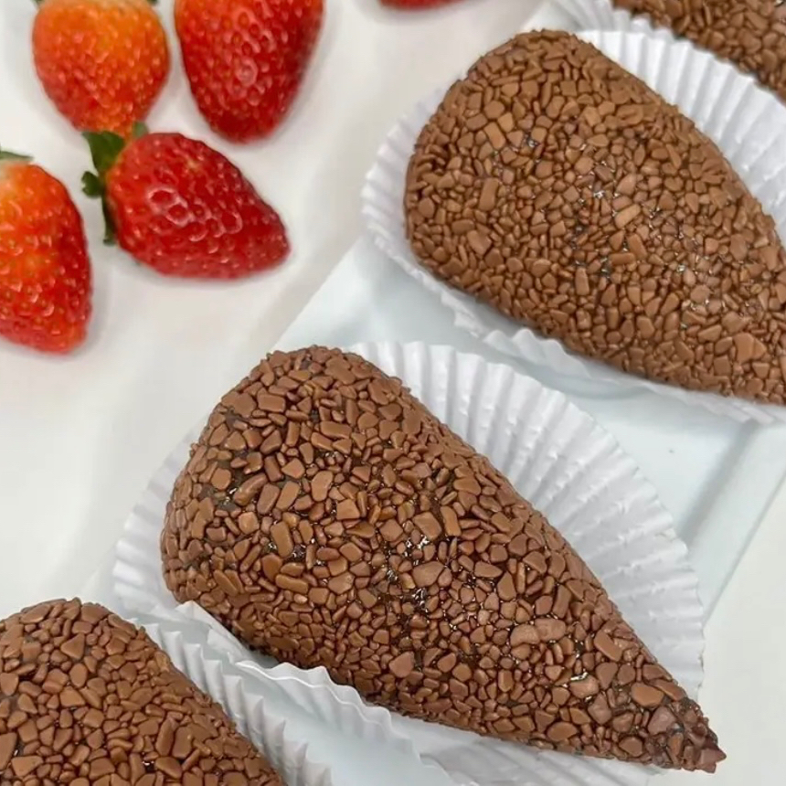 Brigadeiro cremoso ao leite ,envolto do morango e granulado belga
