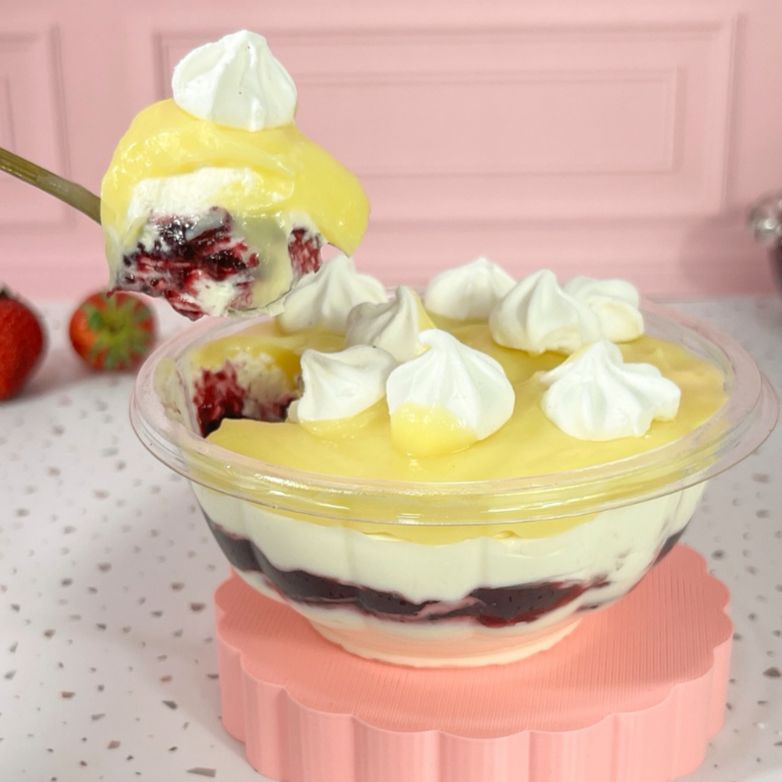 Delicioso mousse nuvem ; com geleia artesanal de frutas vermelhas; finalizado com creme de baunilha e suspiro