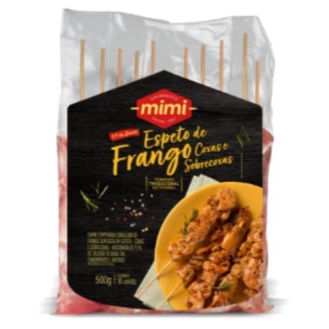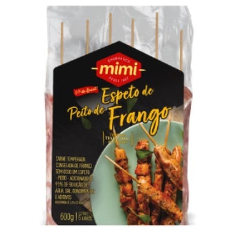 Espetinhos de peito de frango, com sabor deliciosamente marcante, tempero exclusivo da Mimi, matéria-prima selecionada e maciez incomparável, ideal para apreciar em seus melhores momentos! pacote com 500g sendo 5 espetinhos com 100g cada unidade. modo de preparo: retire o produto (resfriado) da embalagem e coloque os espetos na churrasqueira com fogo médio a alto. Vire sempre para que fique com uma cor uniforme e cuidado para não queimar o palito. Dica: pode ser preparado na churrasqueira (carvão), churrasqueira elétrica, air fryer, forno elétrico.