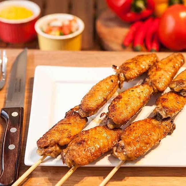 Espetinho de tulipa da asa de frango, deliciosamente suculento, com tempero exclusivo da mimi, matéria-prima selecionada e maciez incomparável.