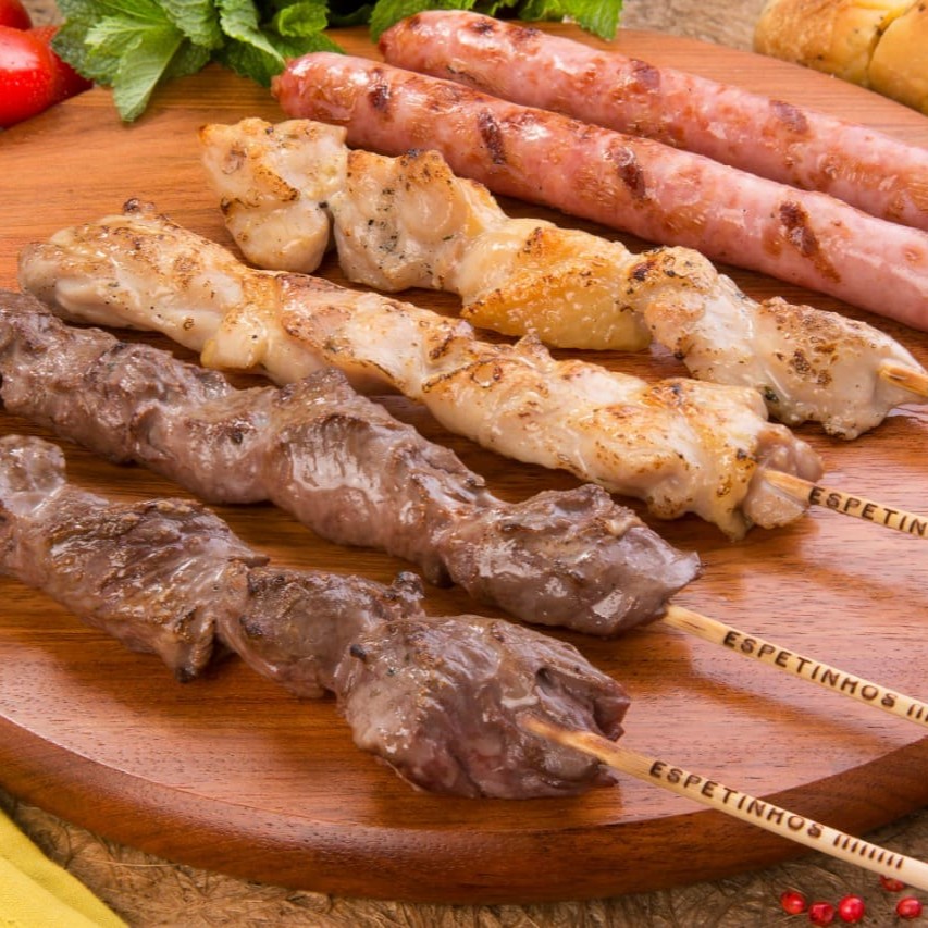 Combo 16 espetos - 4 de carne; 4 de frango (coxa); 4 de linguiça e 4 Pão-de-Alho