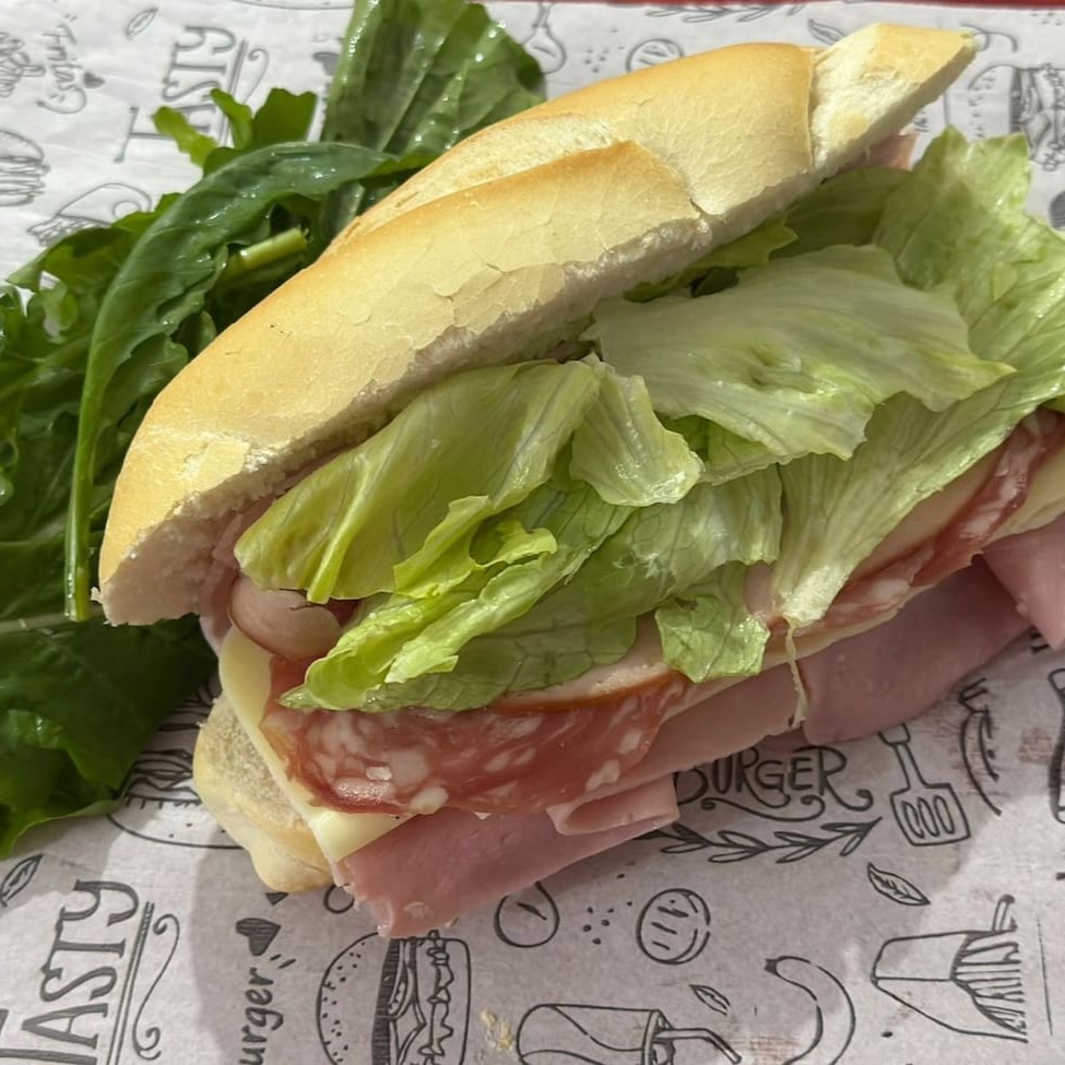 Lanche delicioso, acompanha salame, mussarela, presunto, peito de peru e alface americano, no pão acompanha maionese verde. Serve aproximadamente 1 pessoa. Pesa aproximadamente 220g.