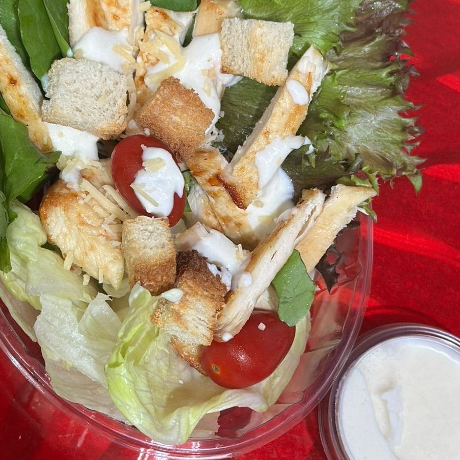 Salada Ceaser, acompanha alface americana, alface roxa, crouttons, tiras de filé de frango, tomate cereja e molho ceaser.