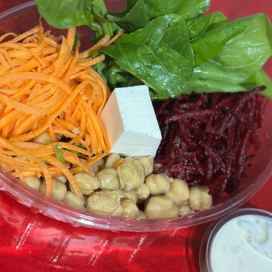 Cenoura ralada, beterraba ralada, agrião, grão de bico e queijo branco, acompanha molho caeser.