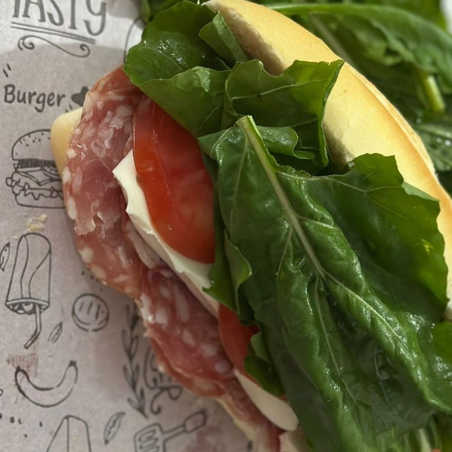 Lanche delicioso, acompanha salame, queijo branco, rúcula e tomate. Pão acompanha maionese verde. Pão tipo baguete. Serve aproximadamente 1 pessoa. Pesa aproximadamente 220g.