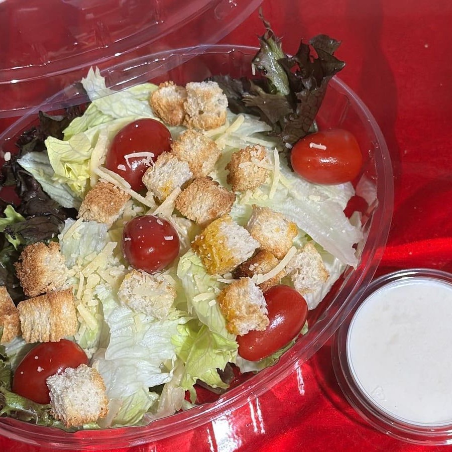 Alface americana, Alface roxa, crouttons, tomate cereja, parmesão ralado e molho caeser. Pesa aproximadamente 200g. Serve 1 pessoa.