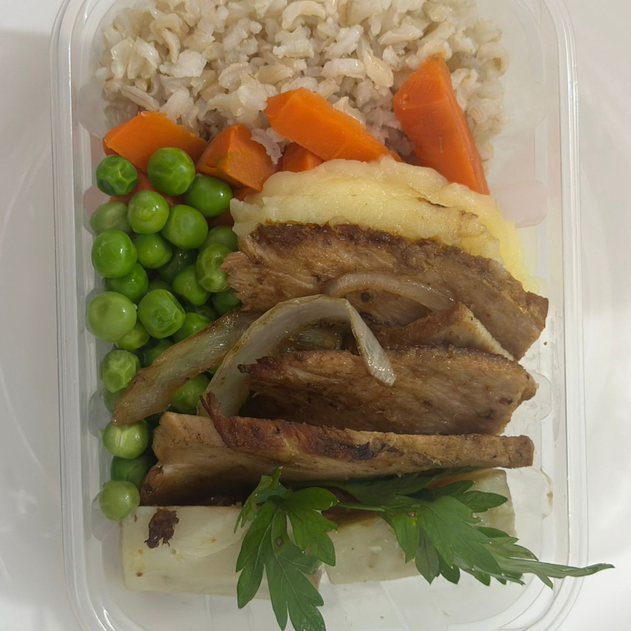 Arroz integral, tiras de pernil, cenoura, ervilha, pure de batata e batata doce Todos legumes são cozidos. Pesa aproximadamente 600g