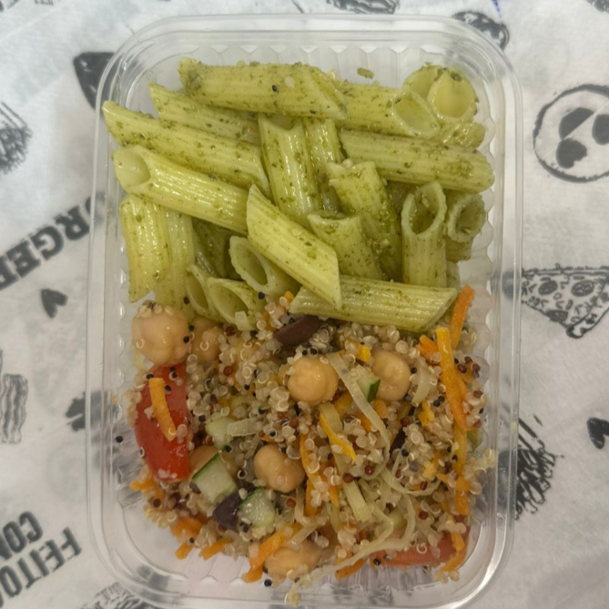 Macarrão Penne sem Glúten ao molho pesto e salada de Quinoa com tomate, grão de bico, pepino, cenoura e temperos.