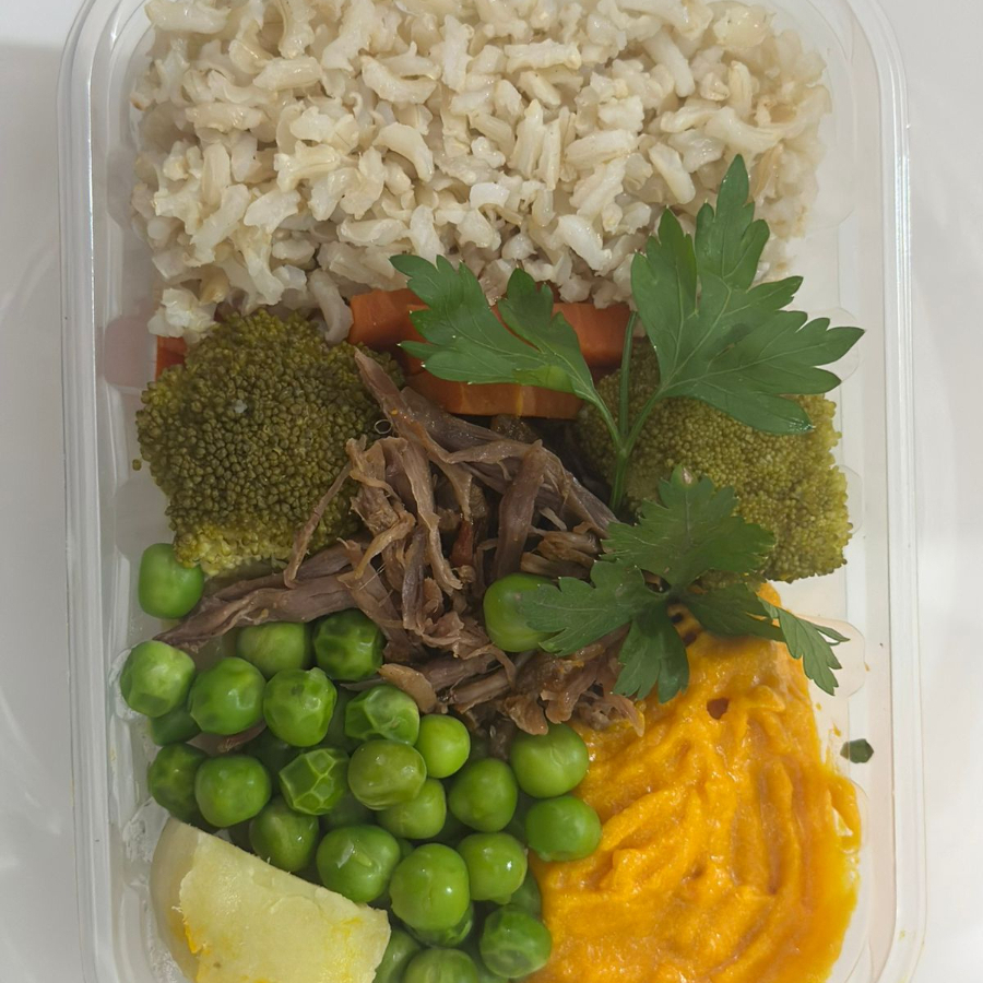 Arroz integral, carne desfiada, cenoura, ervilha, pure de abobóra, brocólis e batata doce. Todos legumes são cozidos. Pesa aproximadamente 600g.