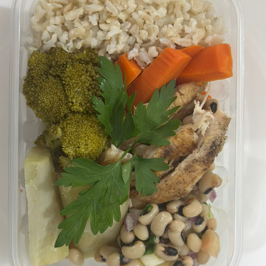 Arroz integral, iscas de frango, cenoura, brocólis, salada de feijão fradinho e batata doce. Todos legumes são cozidos. Pesa aproximadamente 600g.