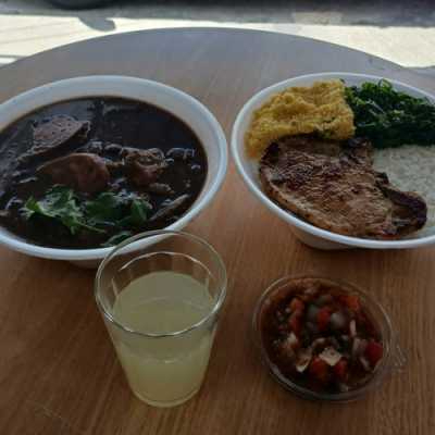 Deliciosa marmita de Arroz, feijão, calabresa acebolada e fritas, alem de salada de alface e tomate