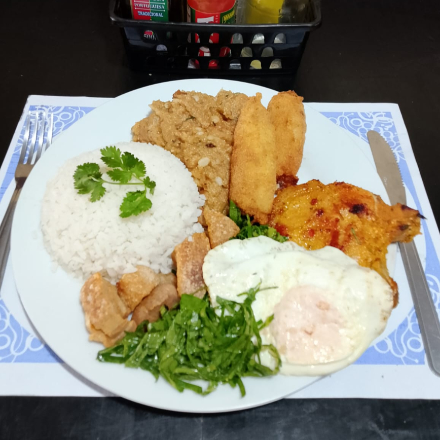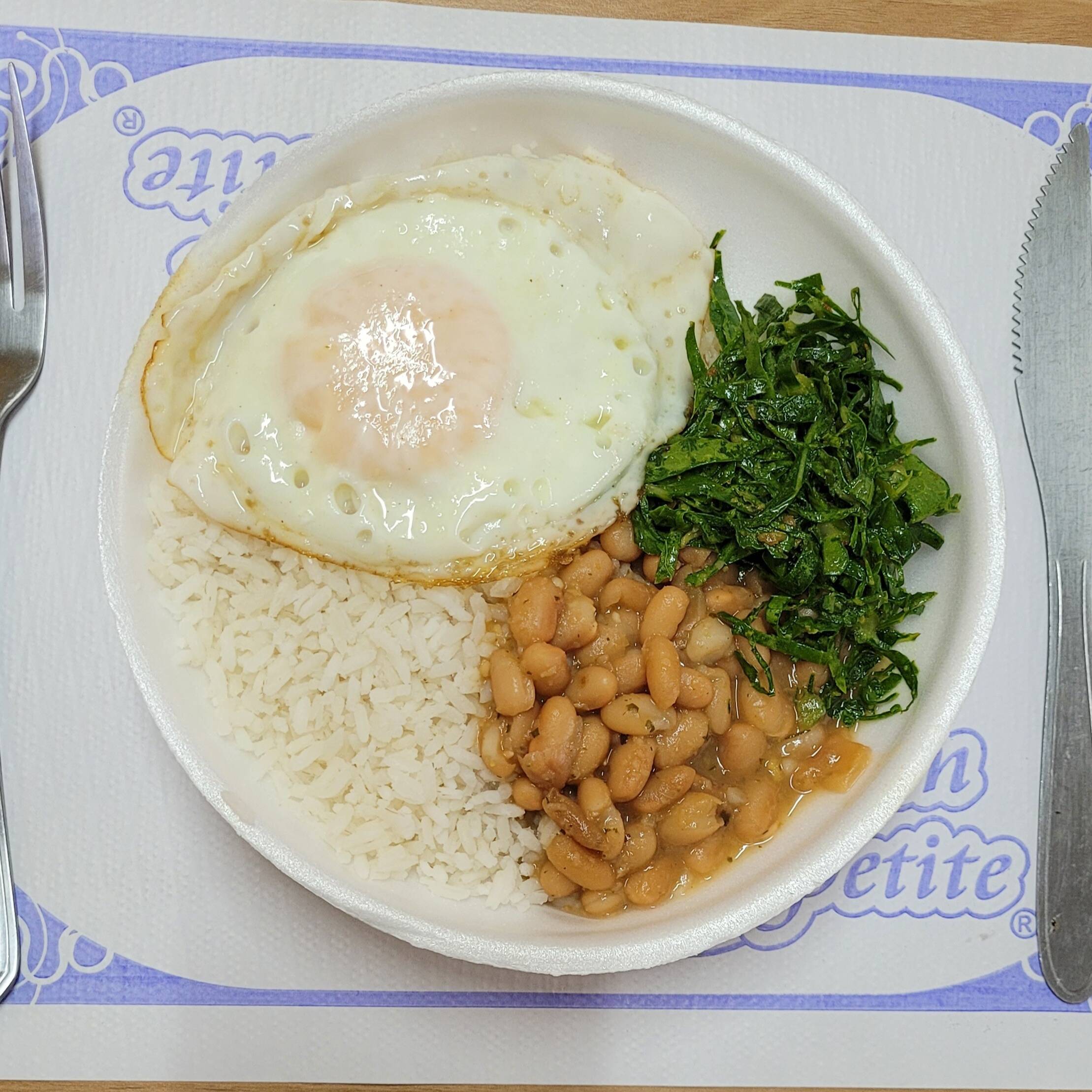 Ovos fritos, batatas fritas, arroz, feijão e verdura refogada