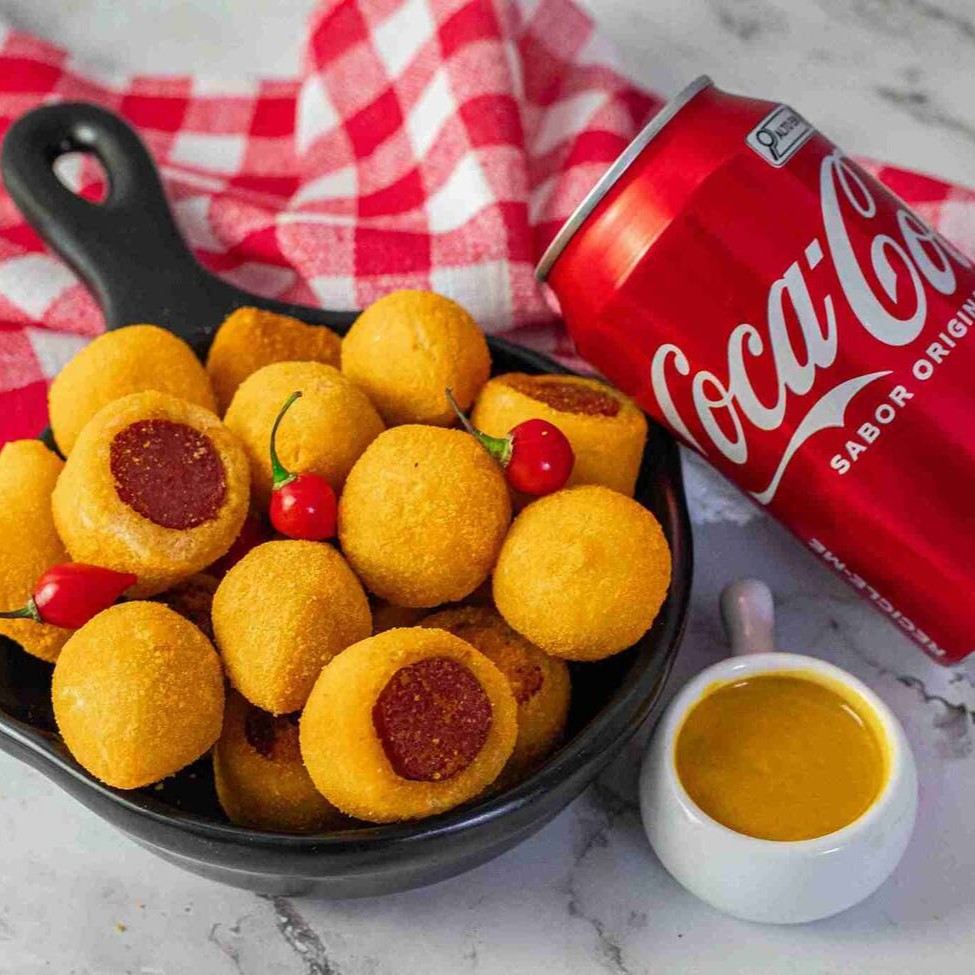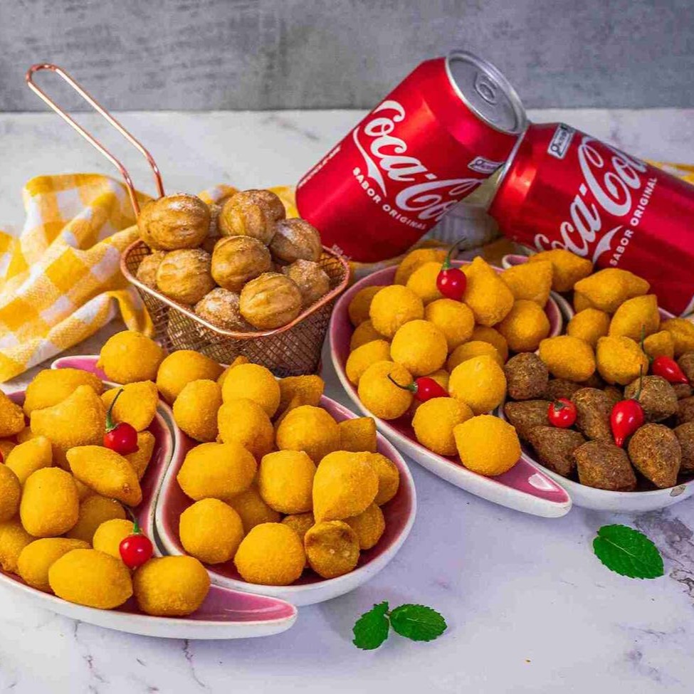 50 deliciosos salgados fritos com Coca-Cola bem geladinha! Ah! Aqui você escolhe os sabores... 7 opções de sabores: Coxinha de frango, bolinha de queijo, quibe, bolinha de carne, Risole de presunto e queijo, bolinha calabresa, enroladinho de salsicha e kibe, Quibe!