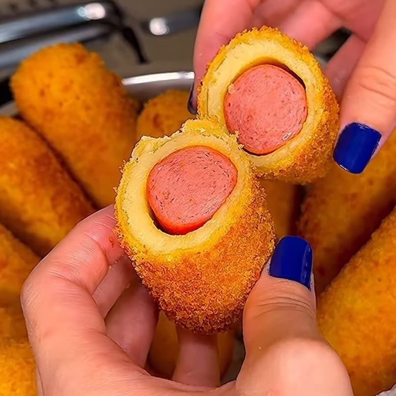 Este enroladão de salsicha é pra você. Massa levinha, e recheio super gostoso. Frito na hora.