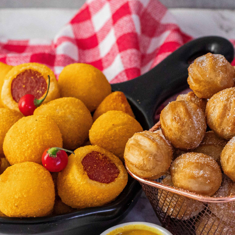 Saboroso Combo com 40 Salgados (20g Cada) Sequinhos e Fritos na Hora. Acompanha 20 CHURROS de doce de leite para adoçar seu dia.