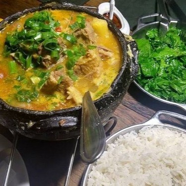 Ensopado de quiabo com frango, couve, feijão, angu e arroz