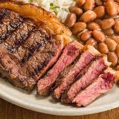 Contrafilé, salada, fritas, feijão e arroz