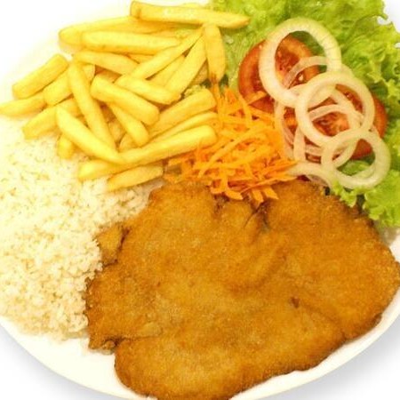 Filé de frango à milanesa, fritas, feijão, salada e arroz