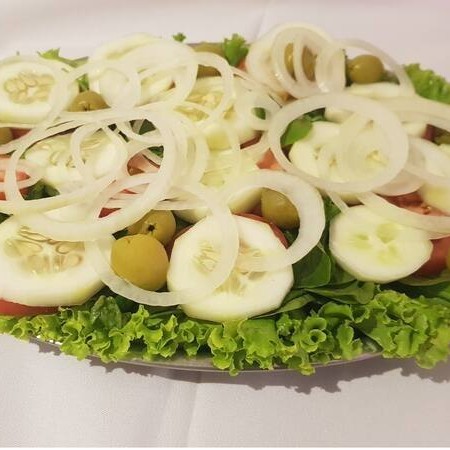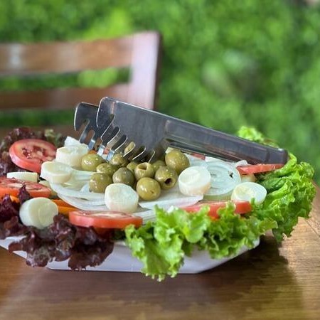 Alface, agrião, azeitona, pepino, cenoura, palmito, tomate, batata e cebola