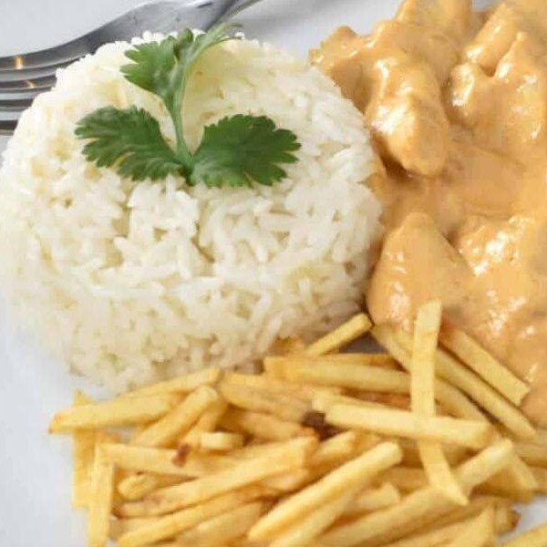 Strogonoff de frango, arroz e fritas