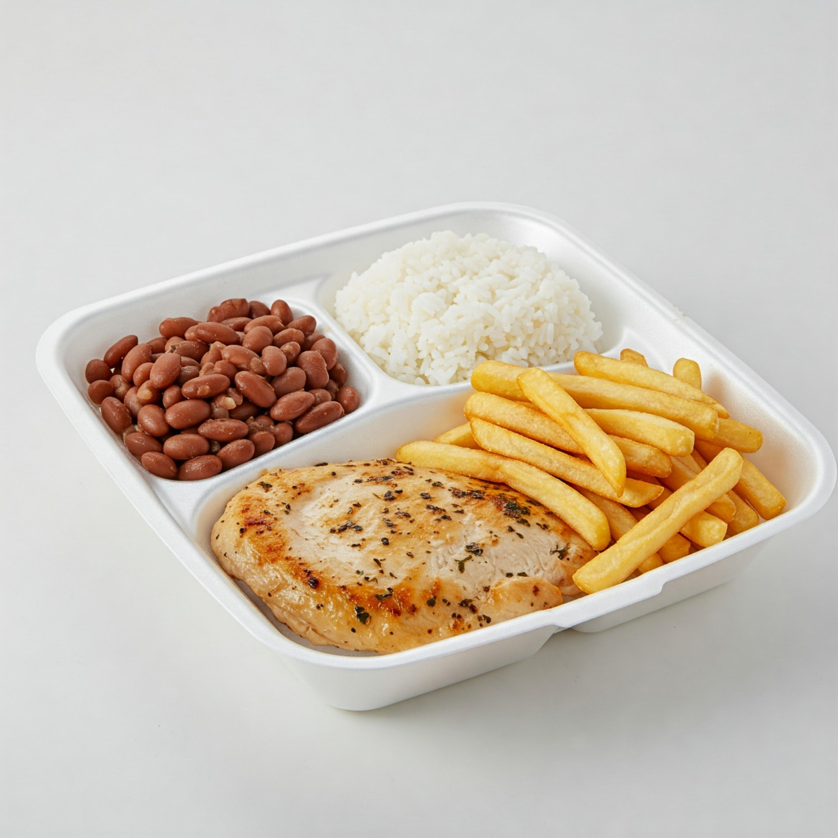 Arroz, feijão, fritas e file de frango grelhado. Marmitex de 500g
