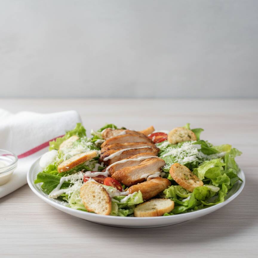 Alface Américana, croutons de pão italiano, parmesão ralado, filé de frango grelhado e molho caeser.