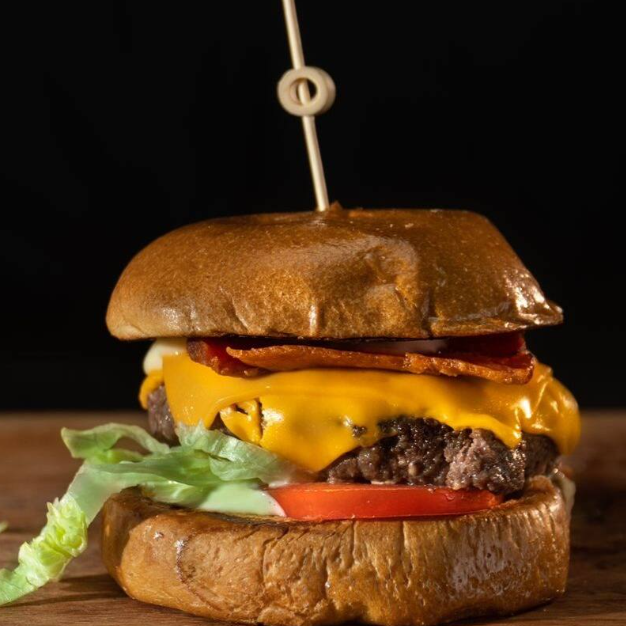 Com bacon, queijo mussarela, cebola caramelizada no pão brioche
