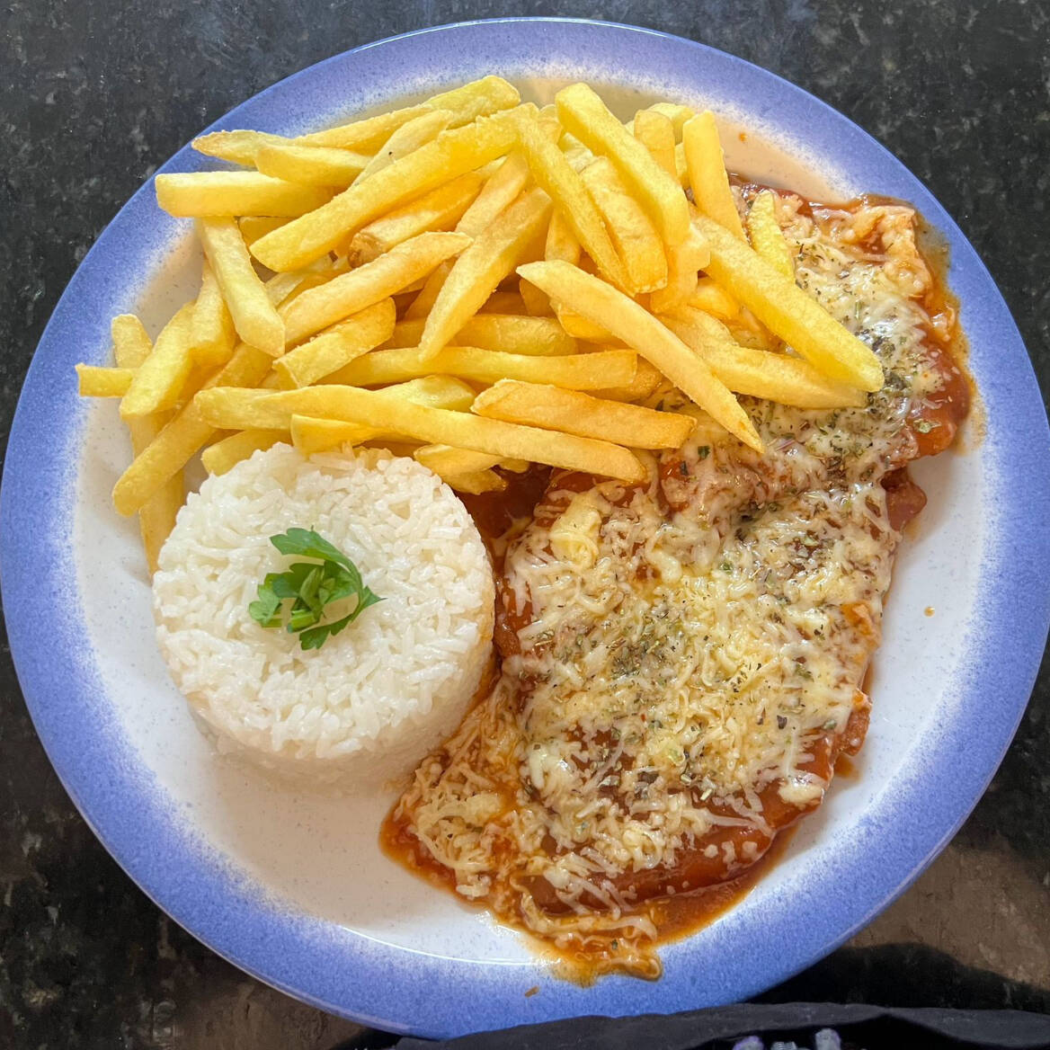 Acompanha arroz branco e fritas.