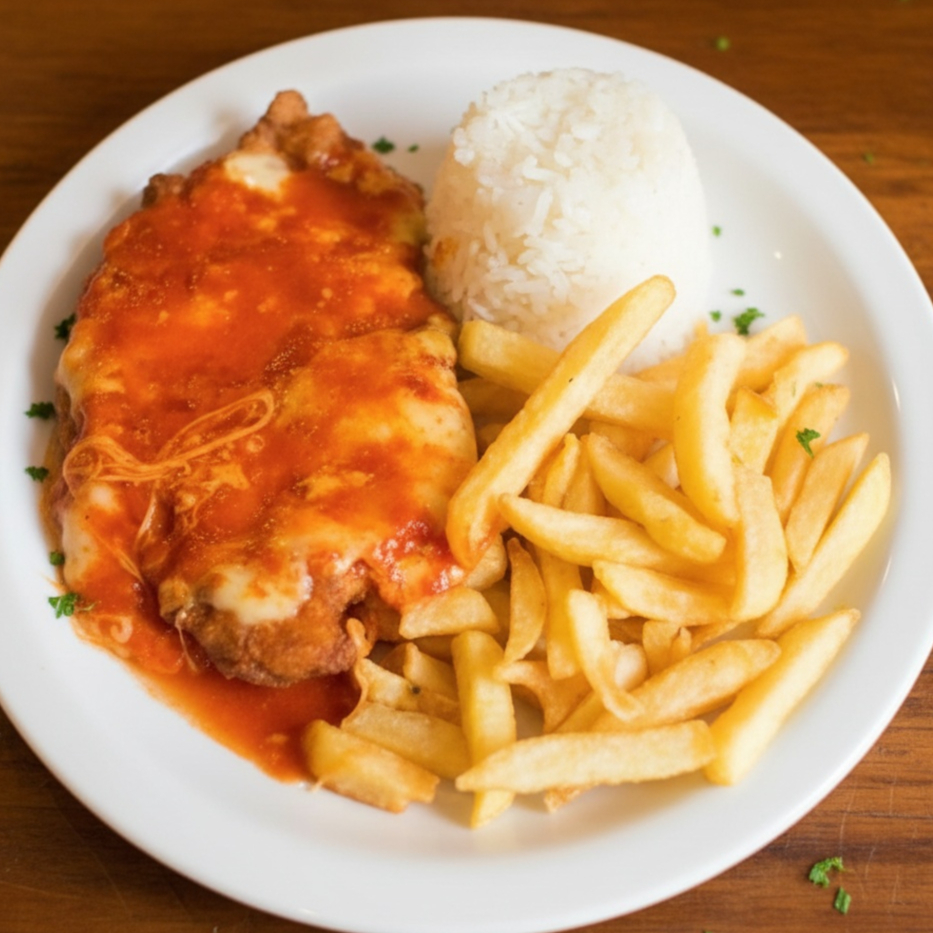 Parmegiana De Carne Acompanha Arroz Feijão Fritas