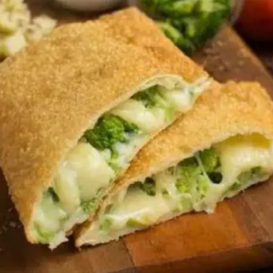 Delicioso Pastel de Brócolis com Mussarela e Bacon. Recheadissimo, crocante, sequinho e frito na hora.