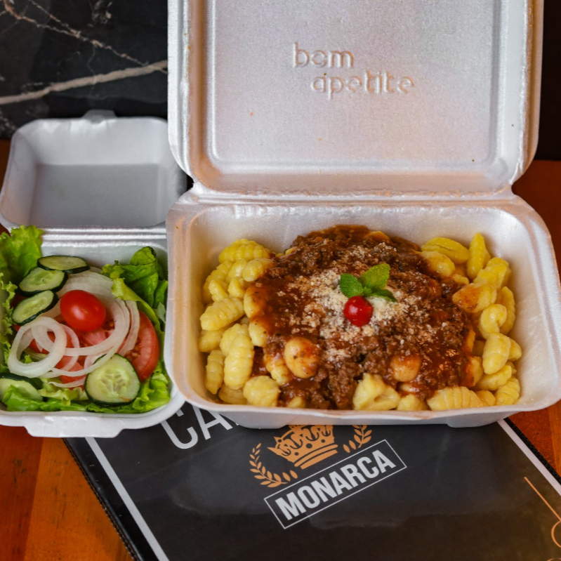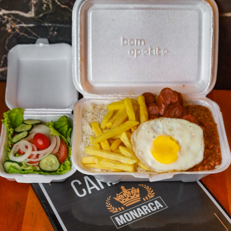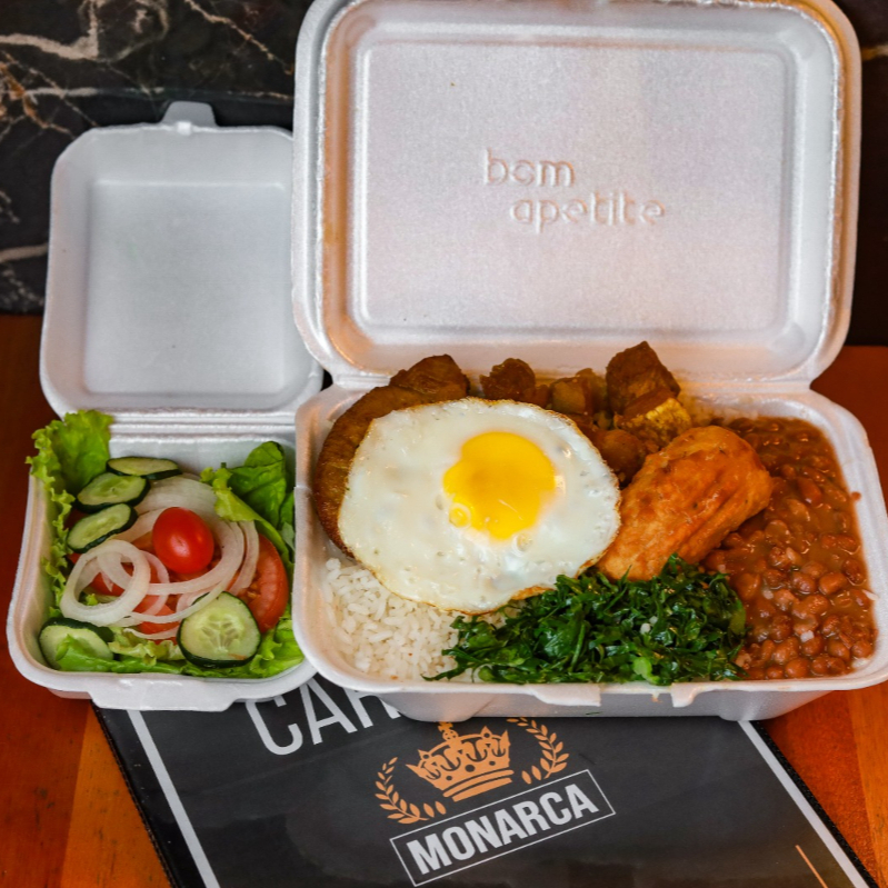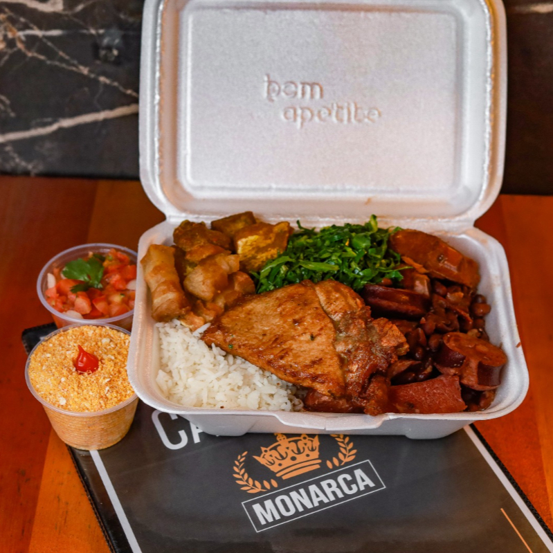 Arroz, Feijão, Farinha de Milho, Bisteca Suína, Toscana Frita, Banana empanada, Ovo estrelado, couve refogada, Panceta frita e Vinagrete. Acompanha Refrigerante Caçulinha.