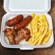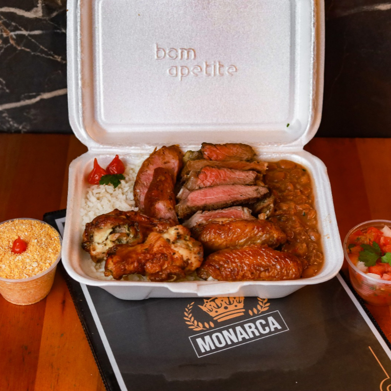 Churrasco feito na brasa, Contra Filé, Toscana, Coxinha da Asa, Arroz, Feijão, Vinagrete, Farofa Especial e Fritas.