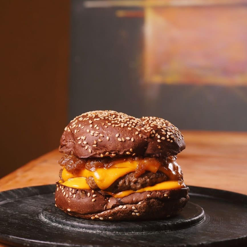 Pão australiano, burguer de 180g, cheddar, cheddar cremoso e cebola caramelizada.