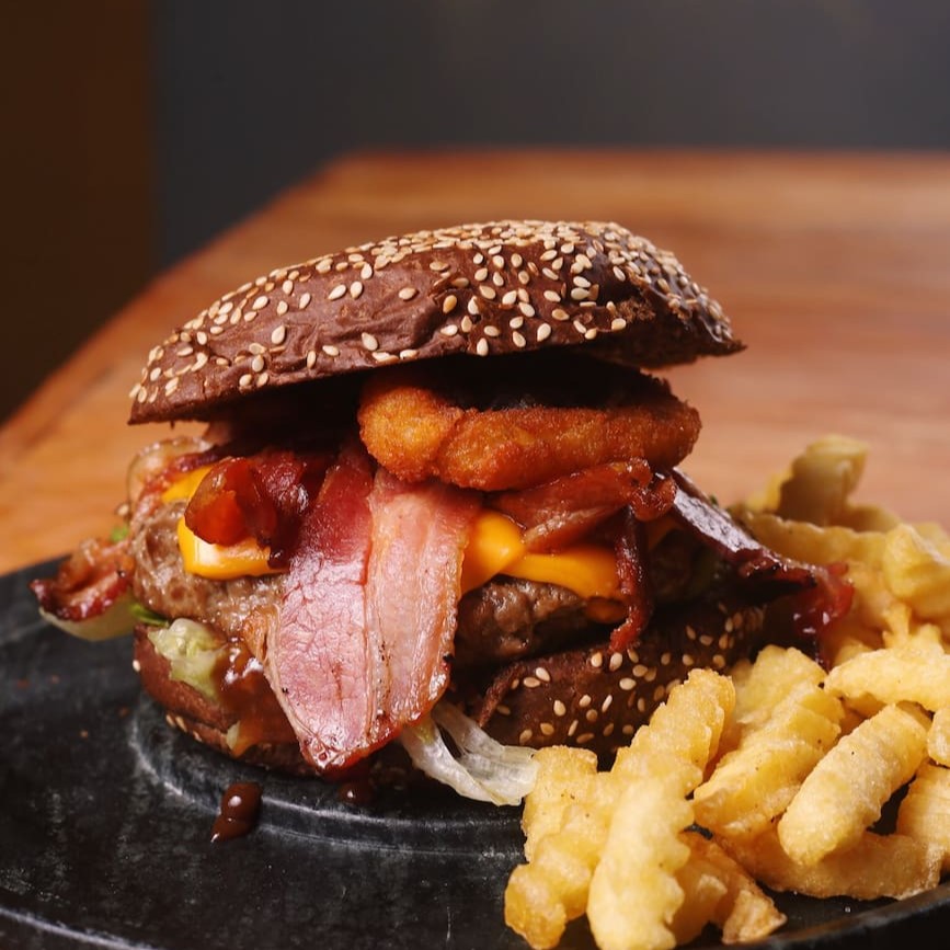 Pão australiano, burguer 180g, cebola empanada, bacon, cheddar, barbecue, cebola caramelizada e alface americana. Acompanha batata crinckle e uma bebida a sua escolha.